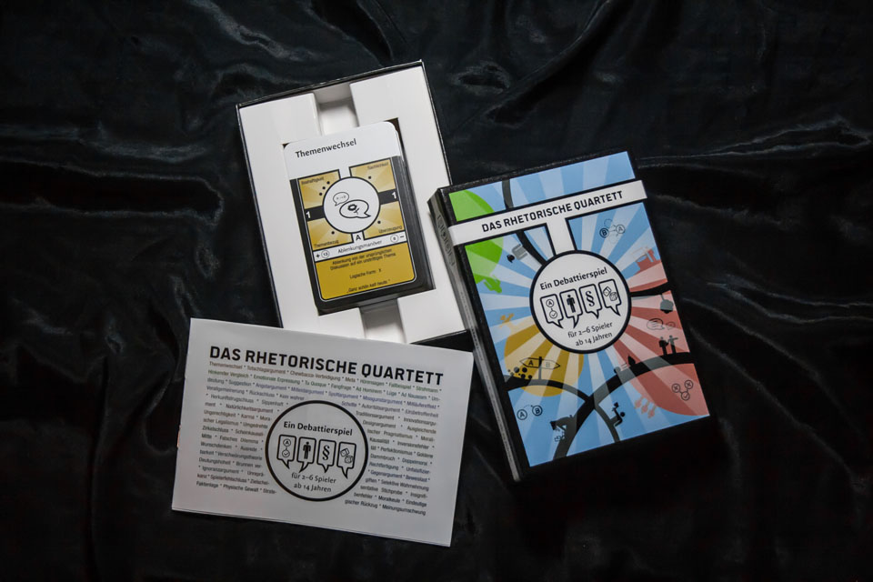 Dann wird es Zeit für das Rhetorische Quartett! Sammle all diese Scheinargumente, Sophismen und Kniffe und hab sie mit diesem Kartenspiel immer dabei. Spiele mit ihnen Quartett, Debattenbingo oder zieh ein paar Karten und nutze sie in einer Diskussion.