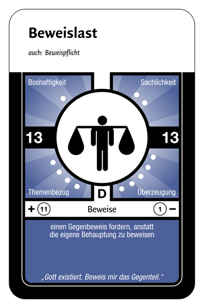 „Gott existiert. Beweis mir das Gegenteil.“ — Die Beweislast nimmt ein Gegenüber in die Pflicht, seine Aussage zu beweisen, oder die Aussage des Anderen zu widerlegen. Es handelt sich dabei um eine gemütliche Möglichkeit, Behauptungen aufzustellen, ohne sie selbst mit Fakten zu unterfüttern. Das wird dem Gesprächspartner überlassen.
